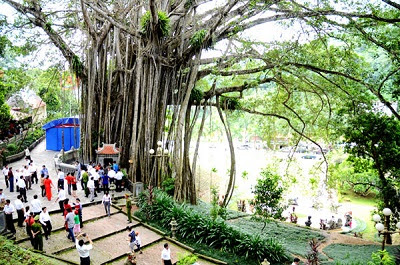 | Gốc đa 300 năm tuổi trên đường vào đền. |